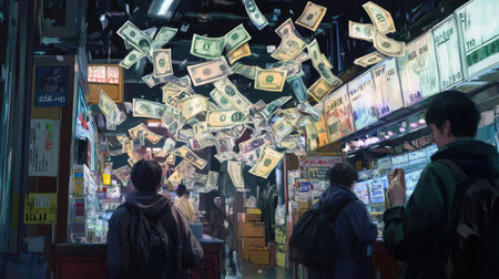 A lively market scene featuring money floating in the air, creating an energetic atmosphere. People engage with vendors amidst vibrant displays of commerce.