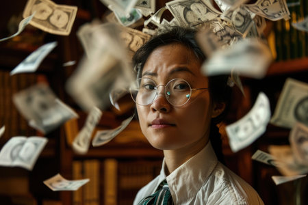 A young woman in glasses looks directly at the camera, with dollar bills raining down around her.