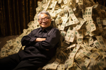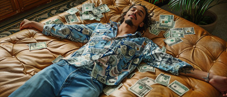 A man reclines on a leather sofa, surrounded by scattered dollar bills, exuding a sense of leisure and financial success.