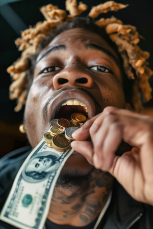 rich indian hip hop performer in cap holding dollar banknotes on black