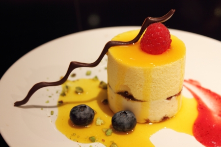 Delicious dessert, A square piece of cheesecake, that filled with mango cream, placed on white plate and decorated with chocolate and strawberry jam.