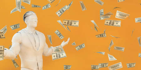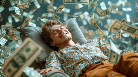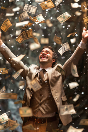 Happy person getting bonus money and banknotes flying in the air and get lucky rich and financial freedom comeliness