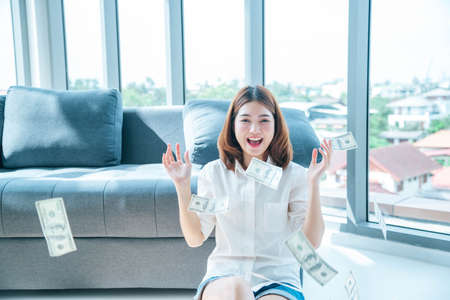 Happy young asian woman holding dollar money and throw in the air celebrate happiness dance wealth lottery money rain drop. Winner Success business woman throw cash flow Happy money smiling face