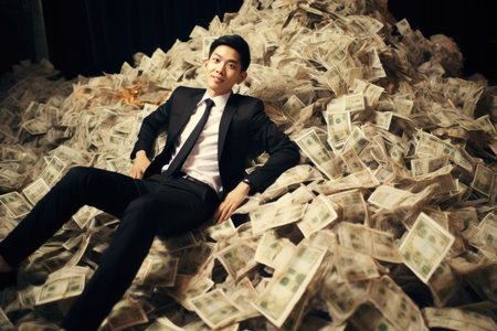 Billionaire on Huge Pile of Banknotes Rich and Prosperity Comeliness