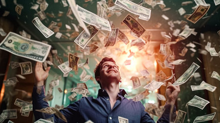 Happy successful man standing under money rain. A lot of dollar banknotes falling on smiling man. Success and wealth concept. Created with Generative AI
