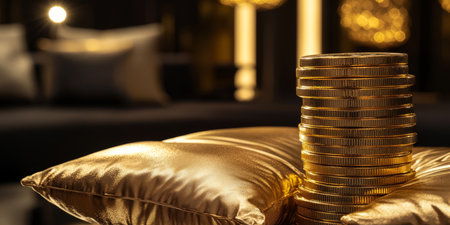 Shiny stack of gold coins with a blurred luxurious backdrop, symbolizing wealth and investment
