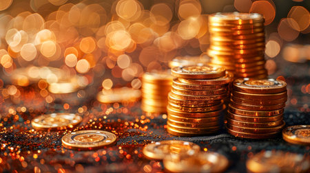 Several stacks of golden coins on a dark surface adorned with glittering confetti, with a warm bokeh effect in the background, representing wealth and prosperity.