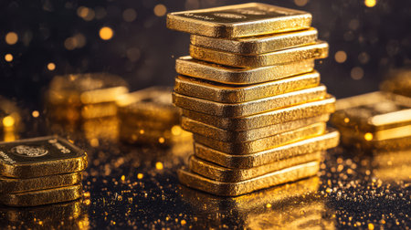A stunning gold metal bar rests elegantly on a glittery surface, illuminated by a beautiful bokeh effect, representing wealth and luxury in a captivating manner.