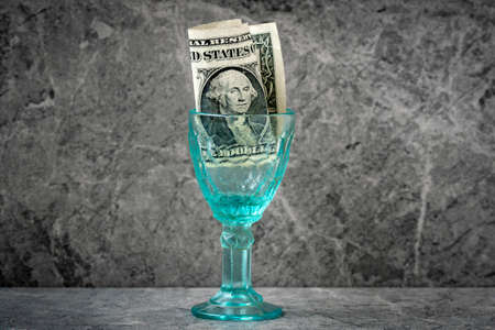 Wineglass with one dollar inside. The concept of alcoholism and a lot of money on alcohol.