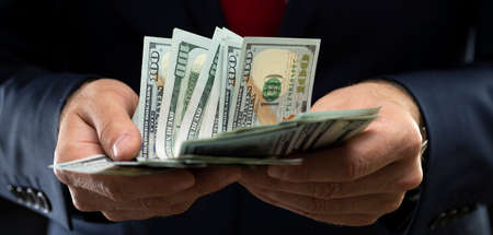 dollar bill. Business man holding Washington American cash. usd money falling banner