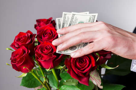 Man with bouquet of red roses and a hundred-dollar bills on a gray background, studio shot