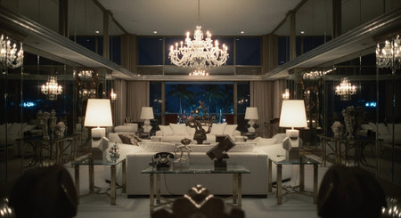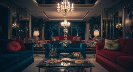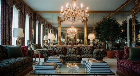A spacious living room features comfortable seating arrangements, including sofas and armchairs. The interior showcases a classic design with gold accents, decorative artwork, and ornate lighting. The overall composition suggests a sense of luxury and sophistication, suitable for various design projects and editorial content.