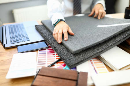 Essential part of the project for interior designer. Picking material and color. Grey, black and white colors mostly on a workplace.