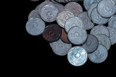 old coins with scratches and other damages after long-term use by the population for calculations, coins close-up, it is difficult to determine the face value of the coins