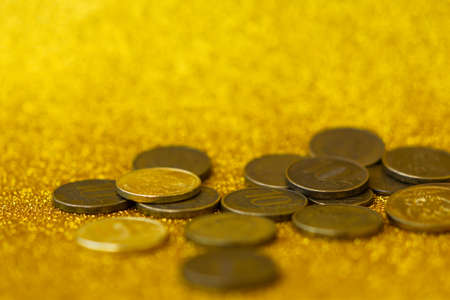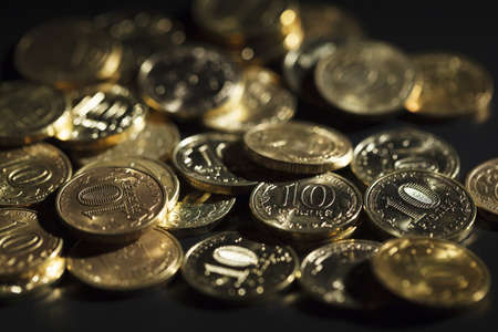 Ruble coin close-up. A group of scattered coins on a shiny gold background. Savings. The concept of business, expenses, income, wealth of success. Russian monetary currency. Settlements in rubles