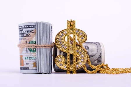 Gold Dollar Sign Necklace on a United States Dollars Banknotes. Financial business background.