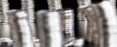 Background from stacks and edges of nickel white coins close-up. Textured backdrop or wallpaper. 1 ruble Economics, banks, refinancing rate, finance, deposits, interest, inflation, recession. Macro