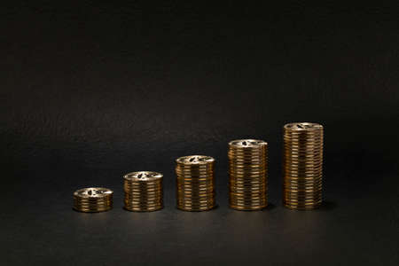 Stacks of coins in a growing progression. Background with copy space for text or inscriptions. Business economic development concept