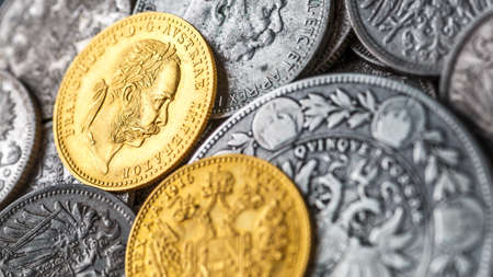 Austro-Hungarian Empire or the Dual Monarchy Gold coins - Close up.Old gold and silver Austrian coins of the 19th century.coin showing austrian emperor Franz Joseph,