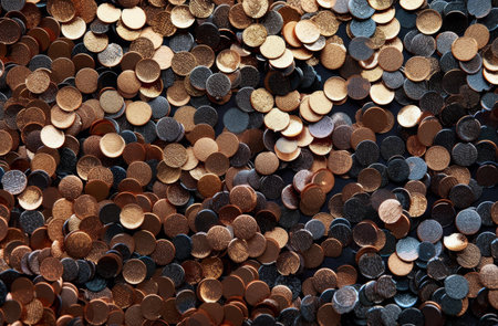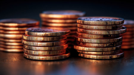 Stacks of shiny copper coins are arranged in visually appealing manner, showcasing their intricate details and reflecting light beautifully. warm tones create sense of wealth and abundance