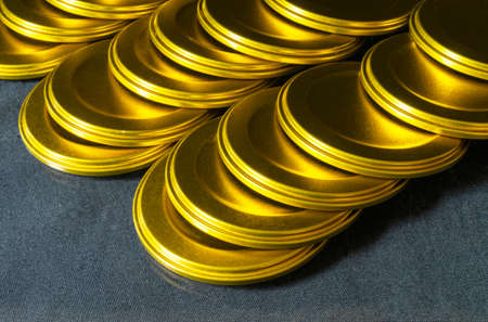 Lid of jar rests upon table close-up gilded color.metal cover for closing of glass jars.