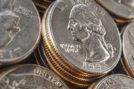 Field of American USA 25 cent quarter coins close-up. Aged illustration about the national currency, dollar, budget and inflation. News about Fed and refinancing rates. Macro