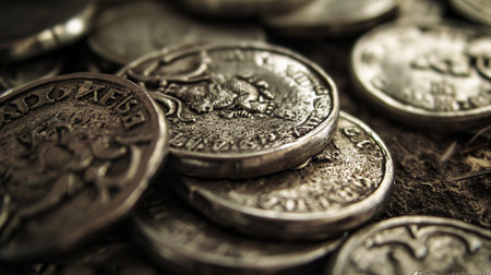 This stunning close-up image features a pile of vintage coins on a rustic surface, emphasizing their distinct textures and intricate details. Perfect for finance themes.