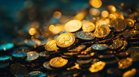 A pile of gold coins illuminated by warm light, creating a bokeh effect in the background, symbolizing wealth, investment, and prosperity.