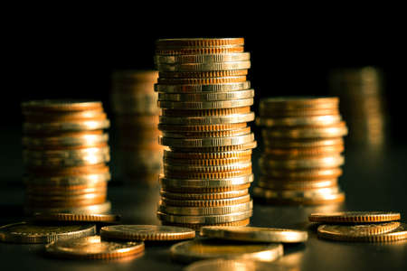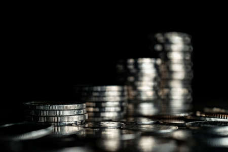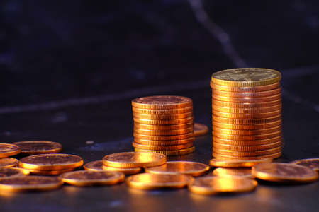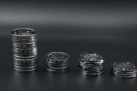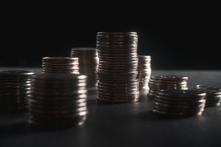 Coins stacked on each other in different positions on dark background. Money concept. Closeup. Money and saving concept. Success, wealth and poverty, poorness concept. Business Growth concept
