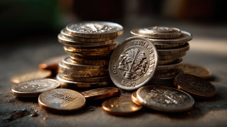 Stacked coins in various denominations create visually appealing arrangement, showcasing metallic textures and colors of currency. image evokes sense of value and finance