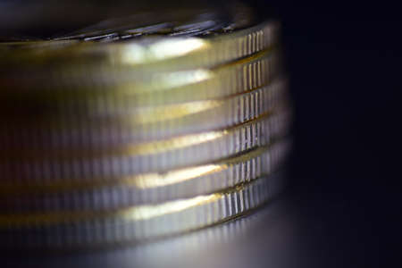 Stack of coins macro. Rows of coins for finance and banking concept. Economy trends background.