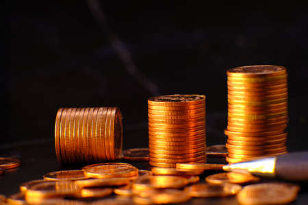 Golden coins on a black background. Business and finance concept. Selective focus.