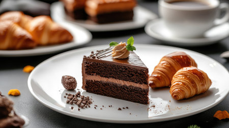 Chocolate cake slice on a white plate, paired with assorted pastries like croissants and danishes, with a cup of coffee in the backdrop, perfect for a dessert or breakfast scene