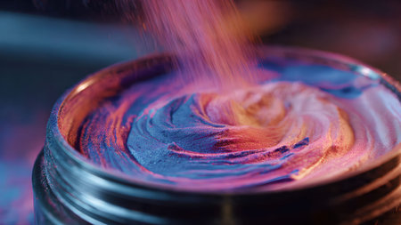 Close-up of vibrant, swirling colored powder in a jar, creating an artistic and mesmerizing abstract composition.