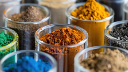 A captivating arrangement of colorful spices and powders in clear glass containers, showcasing a variety of textures and hues, perfect for culinary inspiration.