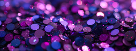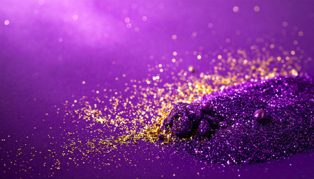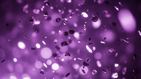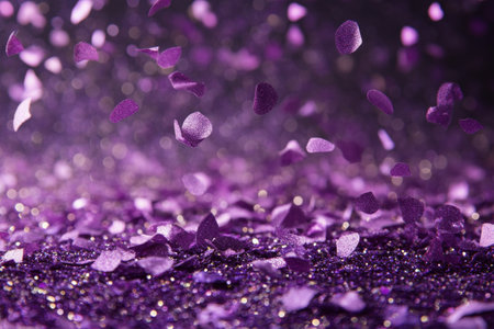 Shimmering purple glitter falls gently onto a sparkling surface, creating an enchanting atmosphere during a festive celebration. The vibrant colors enhance the joyful mood of the occasion.