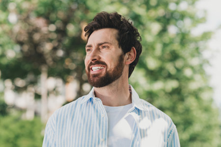 Young man with stylish look enjoys outdoor cityscape under sunlight on a spring afternoon