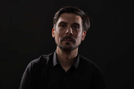 Portrait of a young man wearing a black T-shirt. A man in a black classic sweater on a black background. The dark-haired young man. An enigmatic look.