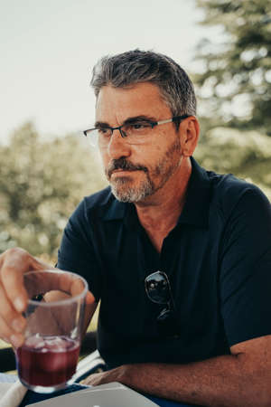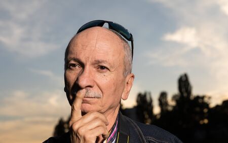 Life style concept. Old man. Portrait of a wise, skeptical and tired of life elderly man on a natural background