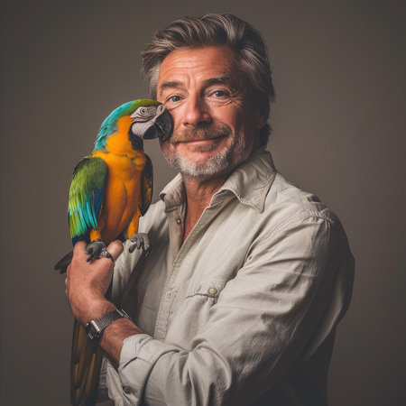A stunning macaw displays its vibrant feathers with shades of blue, green, and red. This captivating bird looks curiously at the viewer, set against a gentle background.