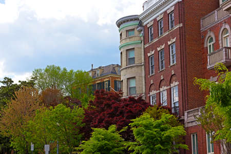 Shades of green color and townhouses in Washington DC during spring. Colors of spring in US capital city.