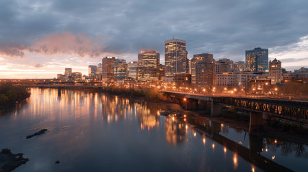 City skyline with lights reflecting on the river at dusk near the bridge