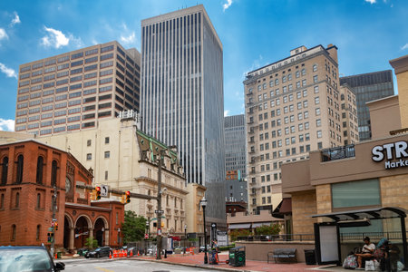 Baltimore street scene with high-rise buildings. Modern towers, red brick facades, and city geometry in the heart of downtown.