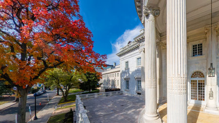 Washington DC architecture with pillars and seasonal trees in bright fall colors.