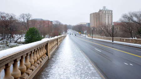 A tranquil winter scene featuring a snow-covered pathway along a serene urban street, lined with modern buildings and bare trees under a soft morning light.