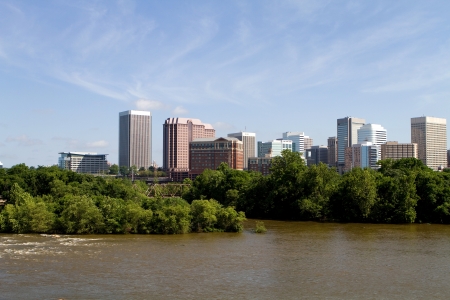 The skyline of Richmond Virginia rises along the James River