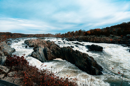View of Great Falls of the Potomac River from Olmsted Island in autumn. Maryland. USA