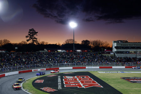 Illuminated grandstands line the edges of a motorsport track during nighttime. The pavement glistens while the empty grandstands await the thrill of racing action. Bright lights cast shadows