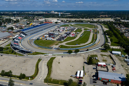 Aerial view of The Milwaukee Mile, the world’s oldest operating speedway, showcasing its iconic oval track, grandstands, and infield road course nestled in suburban Wisconsin.