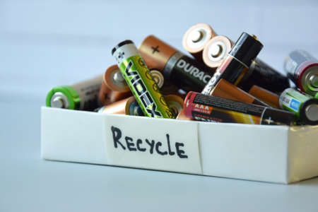 KHARKIV, UKRAINE - February 22, 2022: Used AA batteries and proper disposal of environmentally and soil toxic batteries on a blue background. The concept of processing harmful and recyclable objects.